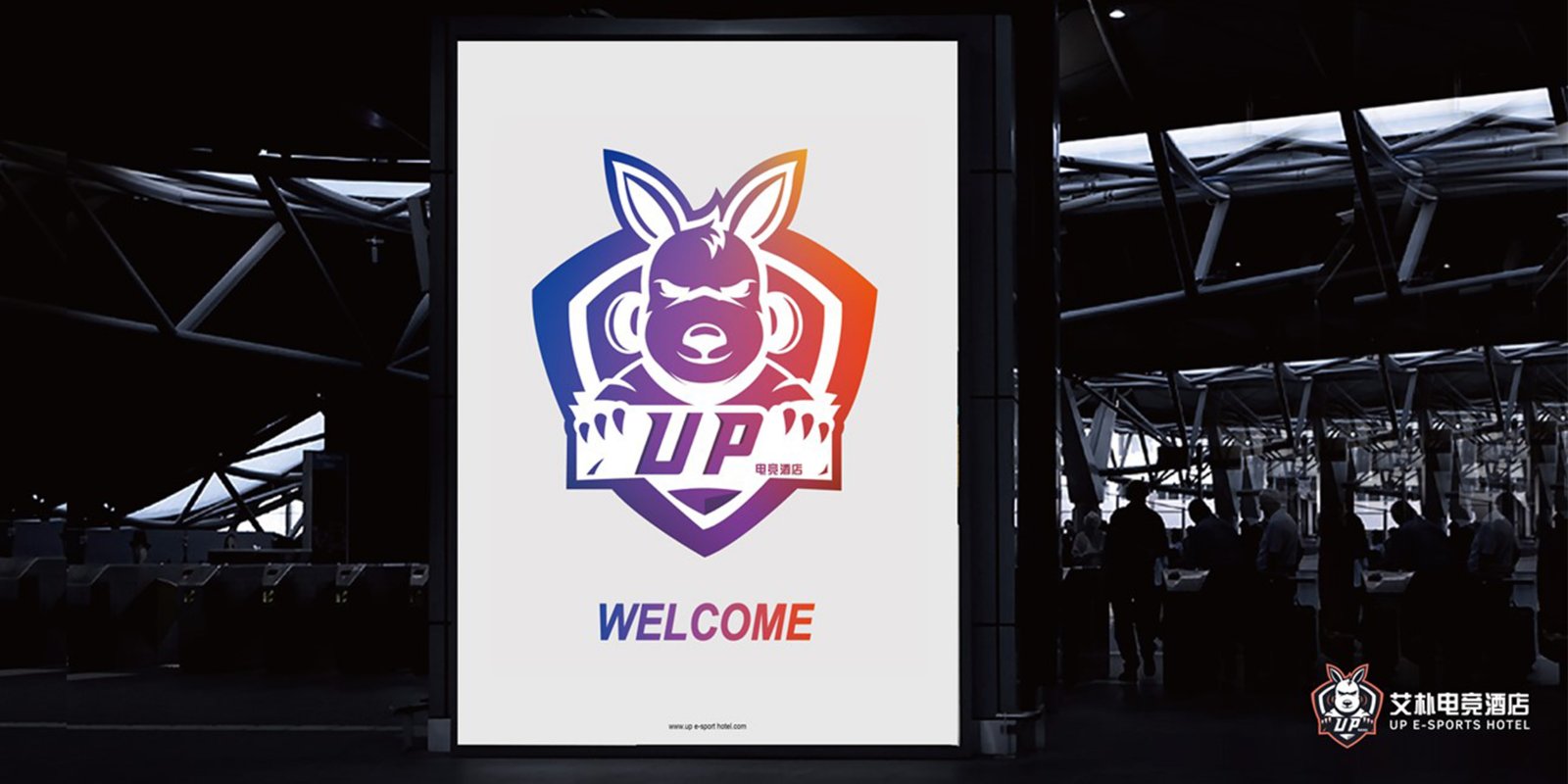 考慮到電競(jìng)酒店的屬性,在標(biāo)識(shí)設(shè)計(jì)上采用英文UP作圖文標(biāo)。袋鼠本身腿長(zhǎng)、有睡袋、只能向前奔跑,這些特點(diǎn)使得袋鼠寓意豐富。UP含有向上的、繁榮的意思,結(jié)合電競(jìng)團(tuán)隊(duì)合作、勇往直前、開拓進(jìn)取、不認(rèn)輸?shù)?游戲精神,以及酒店服務(wù)效率高,服務(wù)范圍廣的經(jīng)營(yíng)理念,因此在眾多動(dòng)物中選用了袋鼠作為代表形象,增強(qiáng)標(biāo)識(shí)識(shí)別度的同時(shí),也寓意著企業(yè)未來(lái)蒸蒸日上。